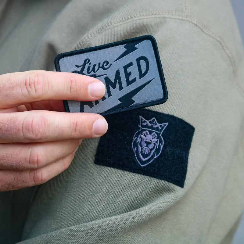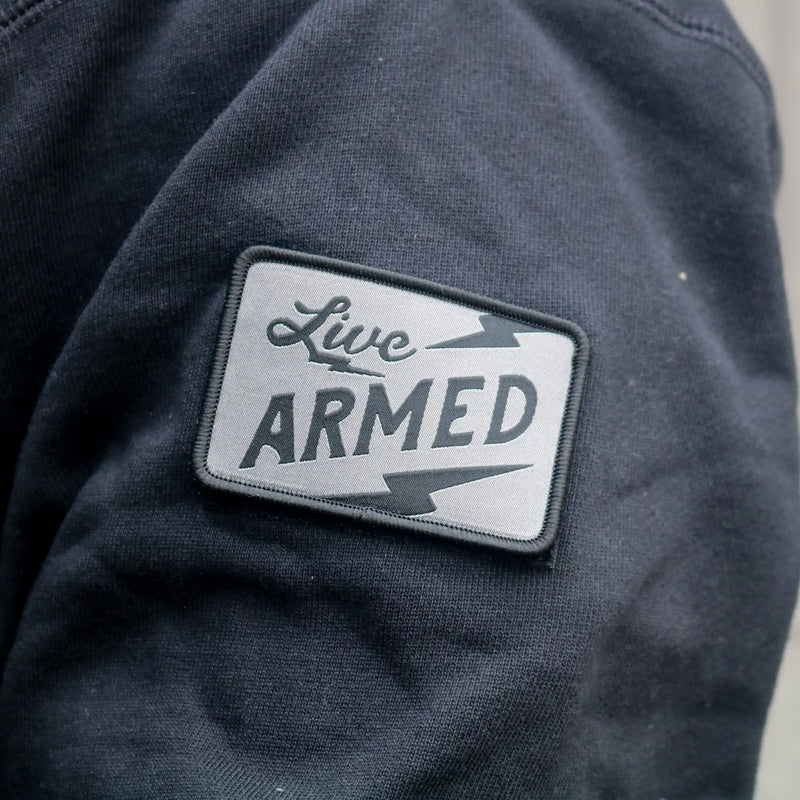 This hook-backed patch fits seamlessly on the Foundation Patch Panel Hoodie, the Live Armed Operator Patch Hat, backpacks, carriers, and any loop surface.